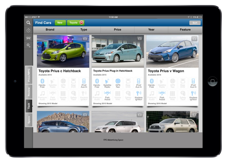The screen below shows the Tech tab in the left navigation, which “flips the cards” and allows an instant visual comparison of important features. The icons make it easy to see, for example, that The Prius Plug-In Hatchback has Satellite Radio, but the Prius c Hatchback and Prius v Wagon do not.