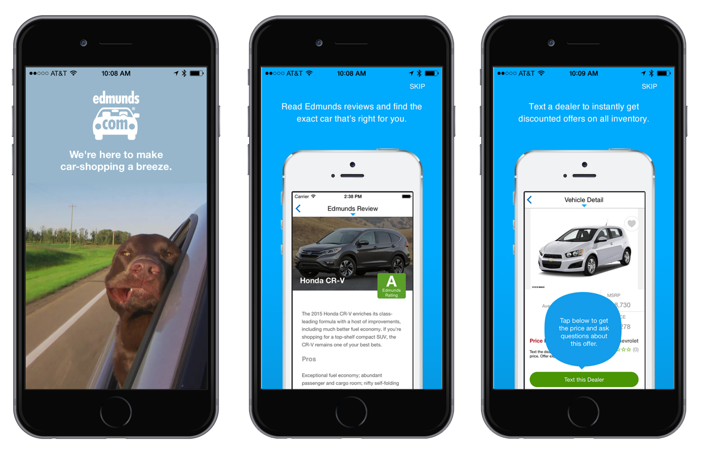 Edmunds wants to make car shopping fun and easy – so what better image to help convey that than a video of this sweet dog enjoying the wind in his face? These friendly introductory screens won rave reviews from our shoppers.