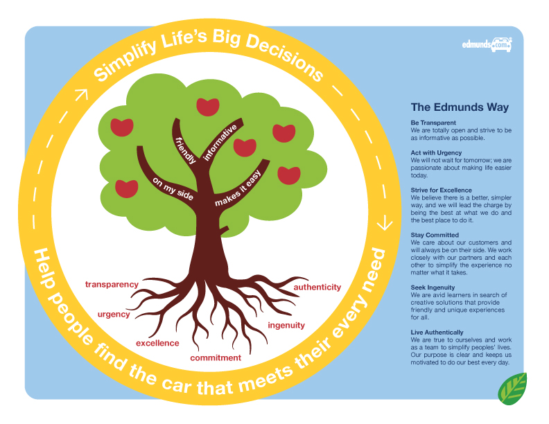 I led a team of over 50 employees and executives in the creation of Edmunds Purpose, Vision, Core Values and Brand Pillars. Meant to be the “evergreen” parts of our brand identity, we visualized them as a tree.